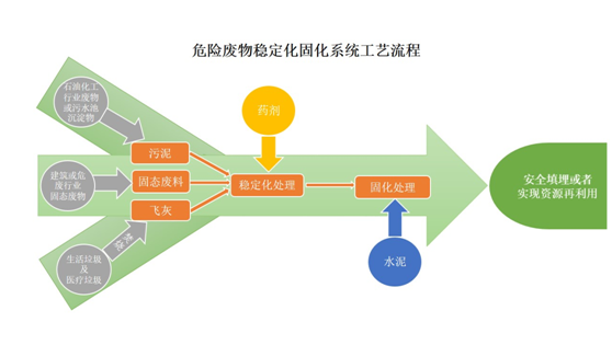 工藝技術:采用水泥基固化法為主、藥劑穩定化為輔的工藝處理技術。通過藥劑的加入將廢物內的重金屬等有毒有害分子通過化學反應進行穩定化處理,再利用惰性基材水泥與水反應后可形成堅固塊體的特征,將有害廢物包容在緊密固化體中,使其中所有污染組分呈現化學惰性或被包容起來,減少重金屬對周圍環境的污染。經過成型處理的固化體具有低毒性、低溶解性、低遷移性,能在較為安全的條件下運輸與處置。